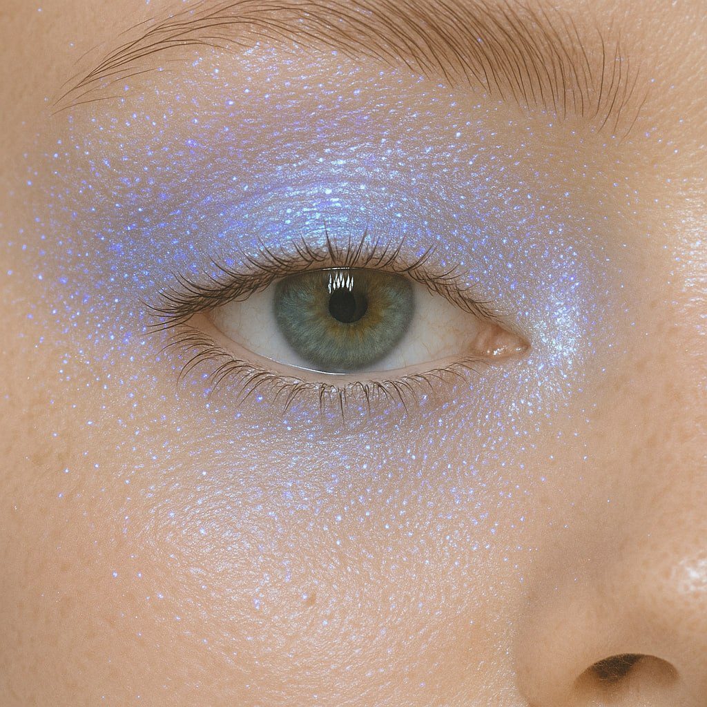 این سایه دارای یک بیس (پایه) رنگی سفید صدفی است، اما ویژگی اصلی آن «هولوگرافیک» بودن است. این یعنی وقتی نور به آن می تابد، بازتابی از رنگ های آبی روشن و یاسی را نشان می دهد و در هر زاویه رنگ متفاوتی دارد.
